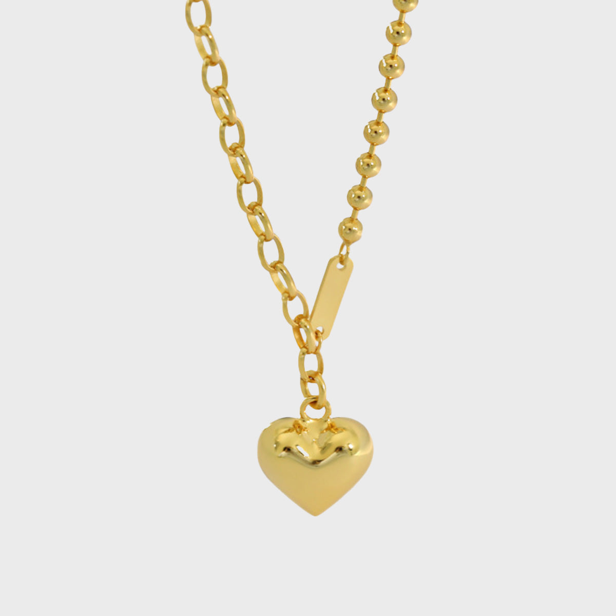 - Design: Dual-chain with one beaded side and one chunky link side, featuring a central puffed heart pendant.