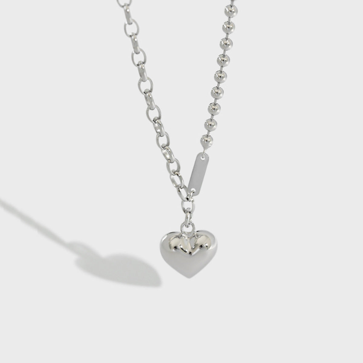 Infuse your collection with K-style charm and elegance with this chunky and beaded chain heart necklace. Designed for women who appreciate both bold statement pieces and minimalist jewelry, it's a top pick for boutiques offering wholesale 925 silver jewelry. Featuring a glossy puffed heart pendant paired with a unique dual-chain design—one side a silver ball chain, the other a bold link—this necklace reflects the latest Korean pop style trends. Whether styled solo or layered, it delivers fashion-forward impact while remaining lightweight for comfortable everyday wear.