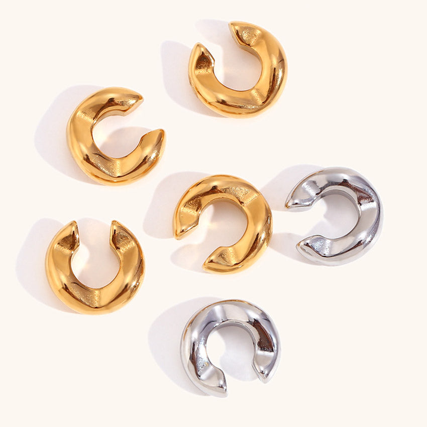 Variety of C-shaped stainless steel ear cuffs available in 18K gold and silver plating.