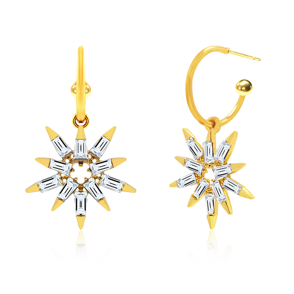- Detailed view of the gold starburst earrings, showcasing the 12 pointed gold tips and 12 clear rectangular-cut gemstones.