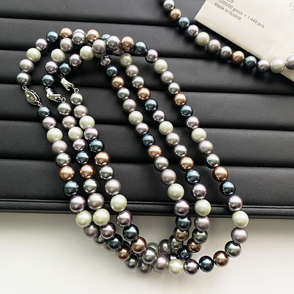 Multiple strands of Morandi-colored pearl necklaces arranged on a black display.