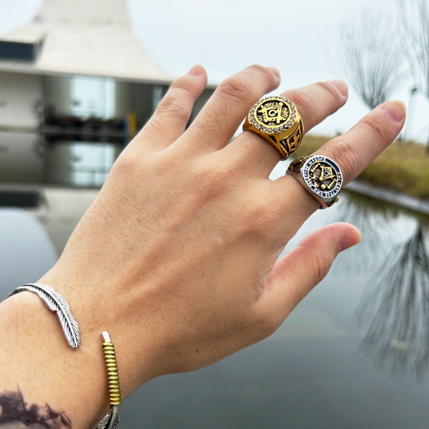 - A collection of custom men's jewelry, including the Masonic ring, worn on a hand to showcase its style.