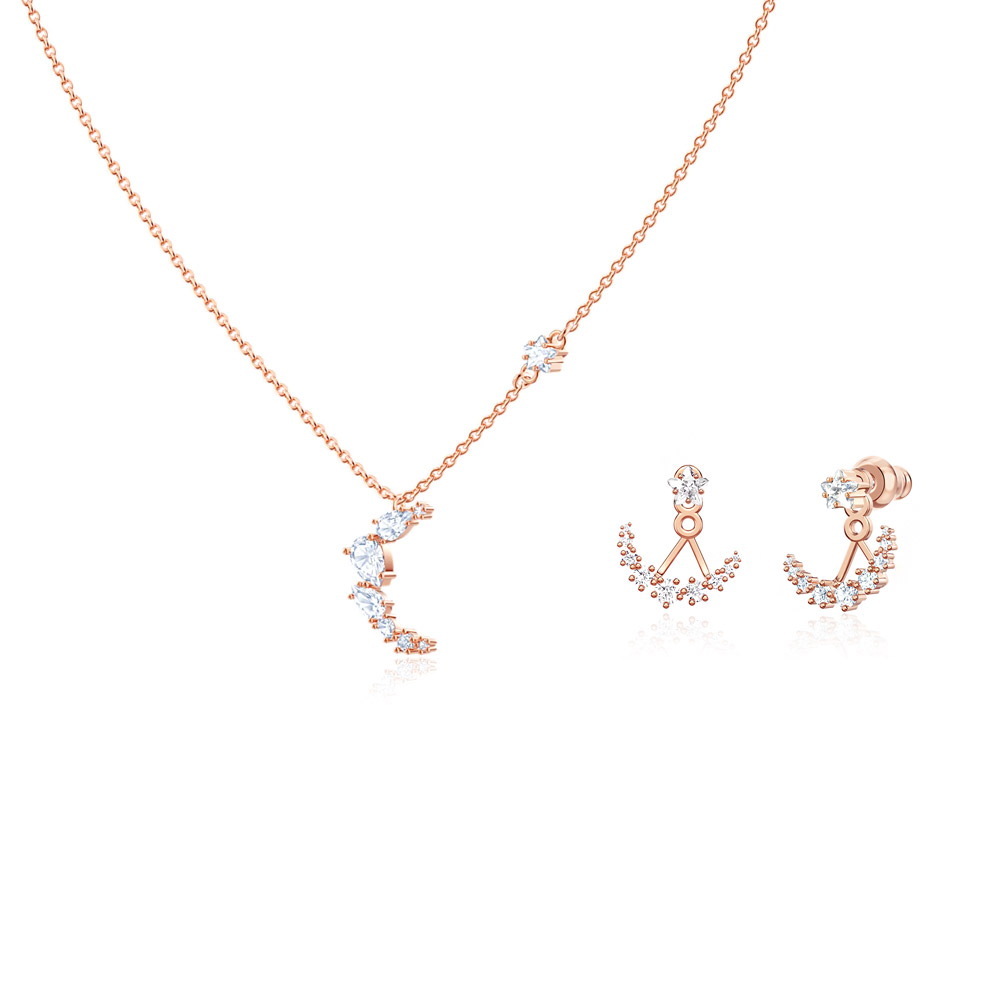 The pierced earrings showcase a delicate moon motif and a complementary star motif, both embellished with prong-set white crystals. A standout feature is the removable earring jackets, allowing you to customize your look. Wear them as simple, elegant studs for a daytime accent or add the jackets for a more dramatic evening style. The refined rose gold-plated necklace mirrors the celestial theme with a glittering moon motif, creating a cohesive and modern design full of expert craftsmanship.
