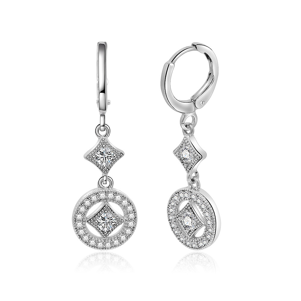 - Close-up of the elegant drop earrings, highlighting the lever-back clasp and the intricate setting of the cubic zirconia stones.