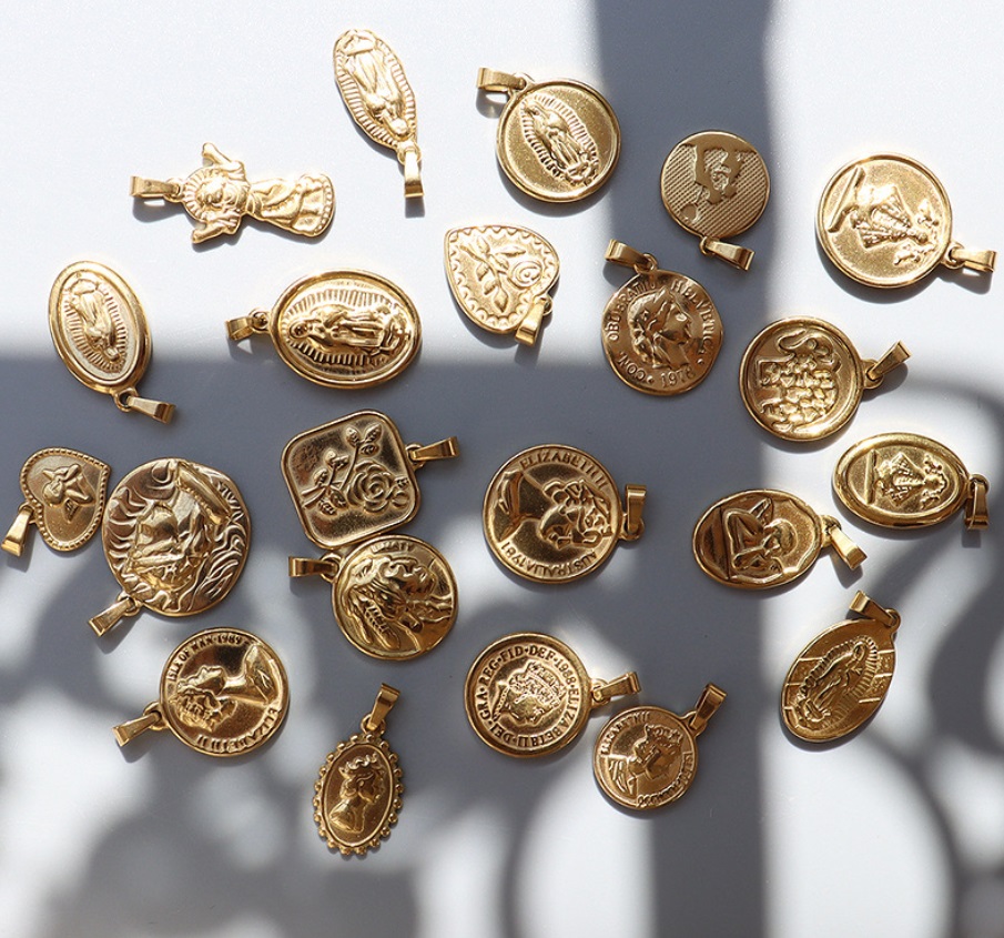 Assortment of custom gold-plated religious pendants in various shapes and styles.