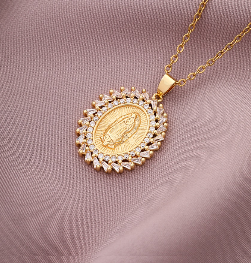 - Detailed view of a custom gold pendant necklace with an engraved religious figure and surrounding gemstones.