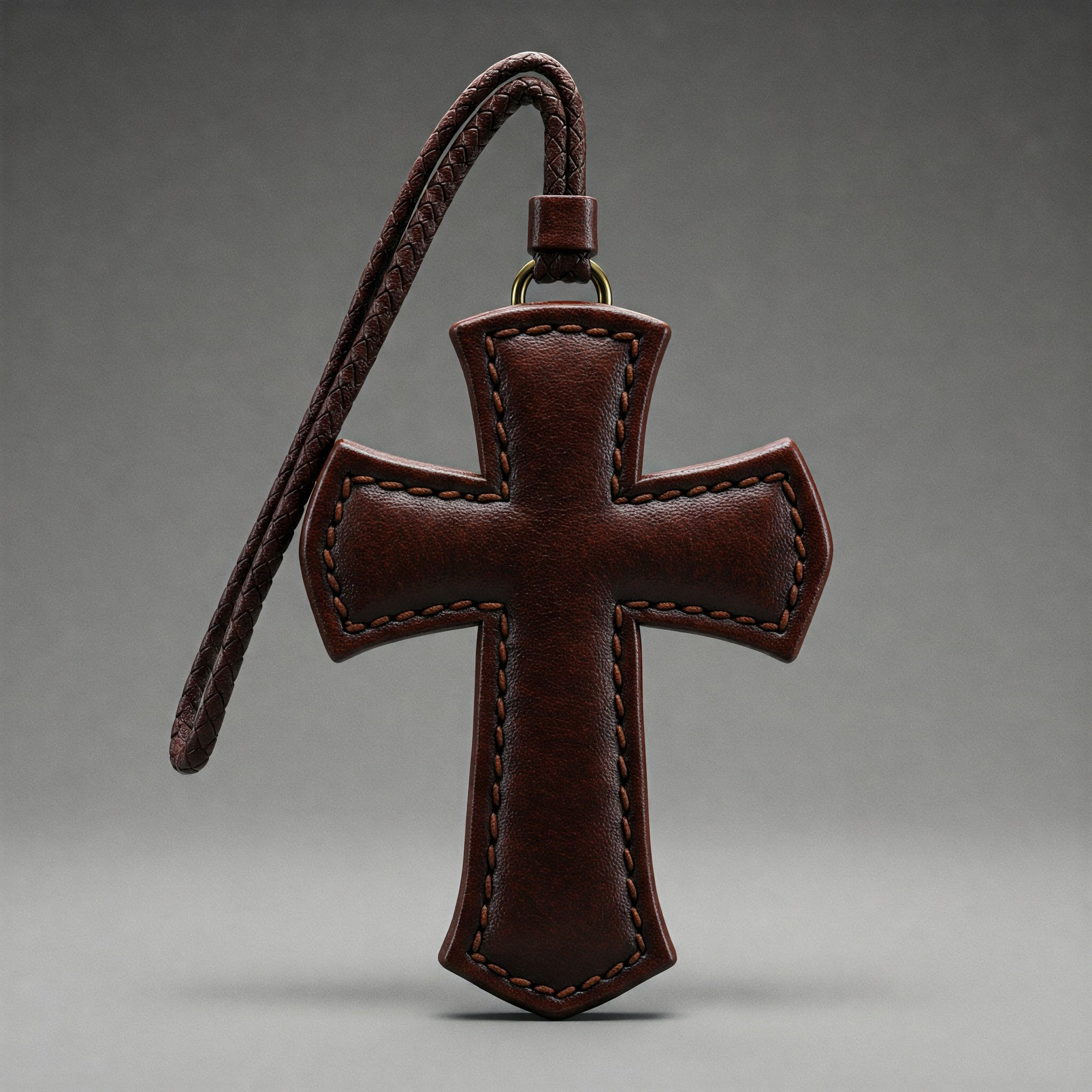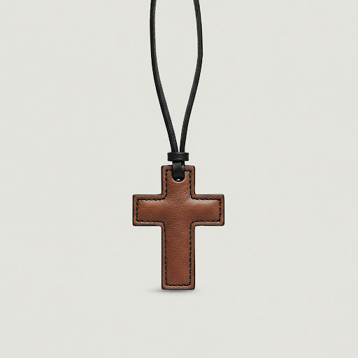 Front view of a simple yet elegant brown leather cross charm.