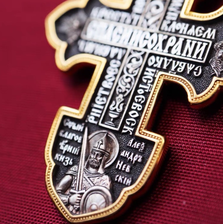 - A decorative cross pendant with a gold border and intricate silver metalwork, customizable for religious jewelry.