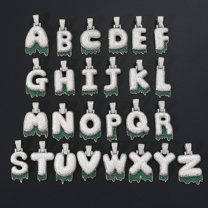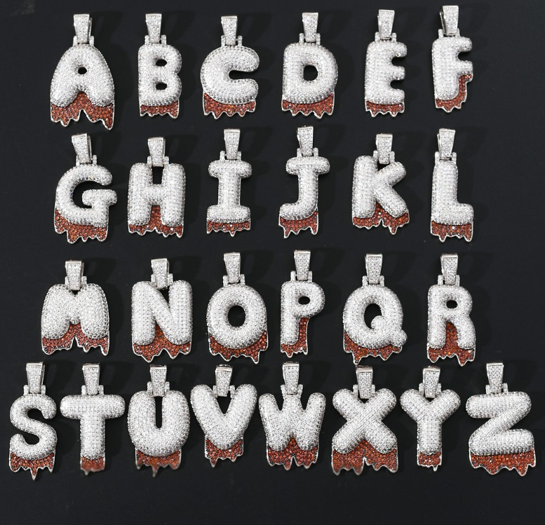 - A full set of custom iced out alphabet pendants from A to Z, showcasing the range of customization.