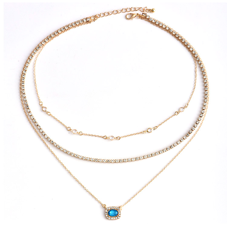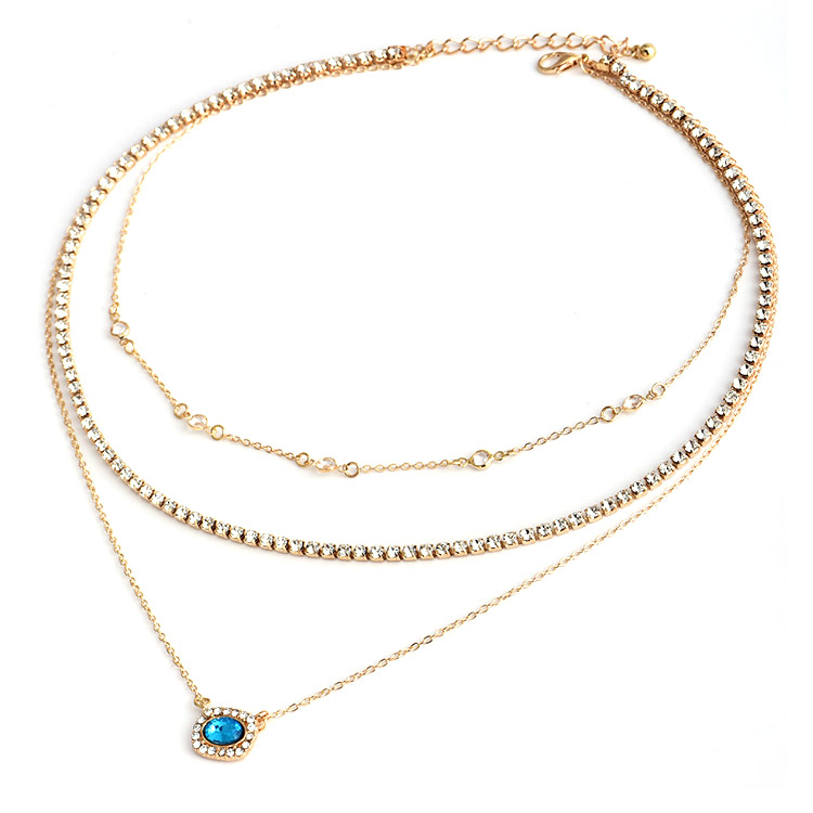 Discover the exquisite 'Blue Gold Pendant Trio' layered necklace from JR Fashion Accessories. This elegant piece features a sophisticated three-layered design, beautifully crafted from high-quality alloy with lustrous gold plating. Adorned with sparkling crystal and glass fittings, it adds a touch of glamour to any outfit. With its versatile style and secure 10mm spring clasp, this necklace is perfect for both casual and formal occasions. As a leading jewelry manufacturer, we offer this design for wholesale and welcome custom OEM/ODM orders to meet your brand's unique vision.