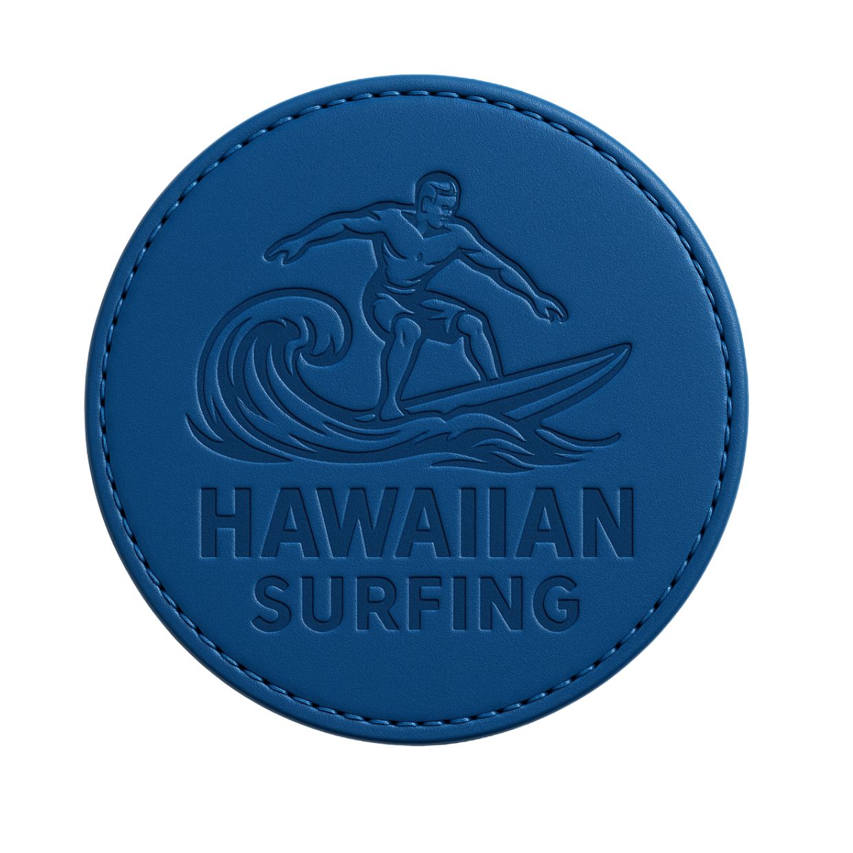 Vibrant blue leather coaster with a Hawaiian surfing theme illustration.