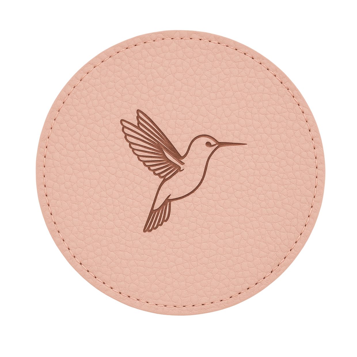 Pink PU leather coaster with a colorful printed hummingbird design.