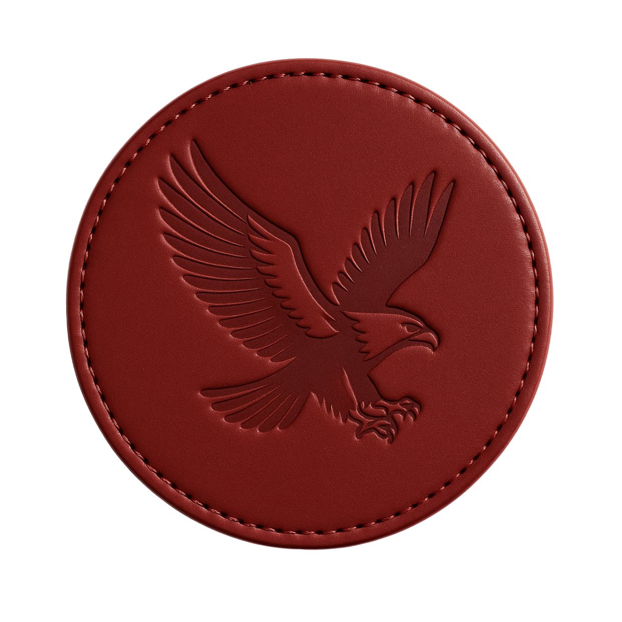 Bold red leather coaster with a stamped eagle logo, ideal for corporate branding.