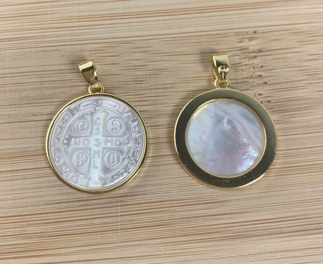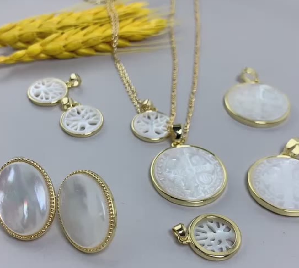 - A collection of custom religious jewelry pieces, showcasing various mother-of-pearl pendant designs and styles.