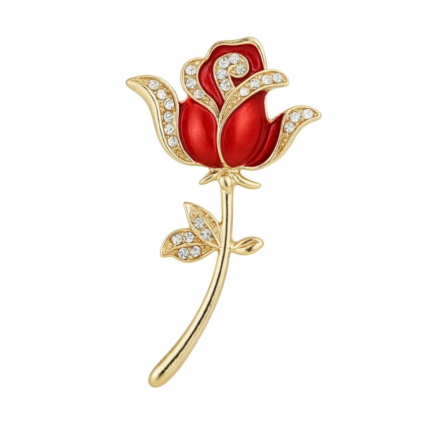 - Luxurious gold-plated red enamel rose brooch with shimmering diamond accents.