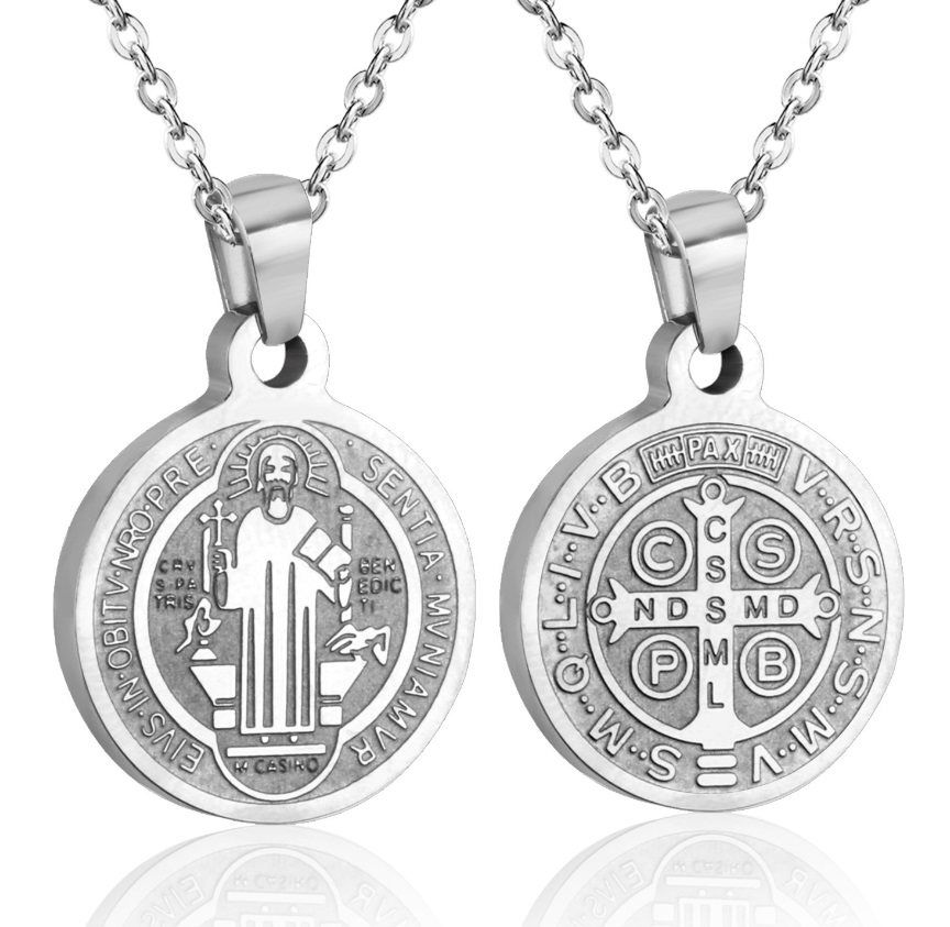 - Two silver Saint Benedict medal pendants showcasing detailed religious engravings.