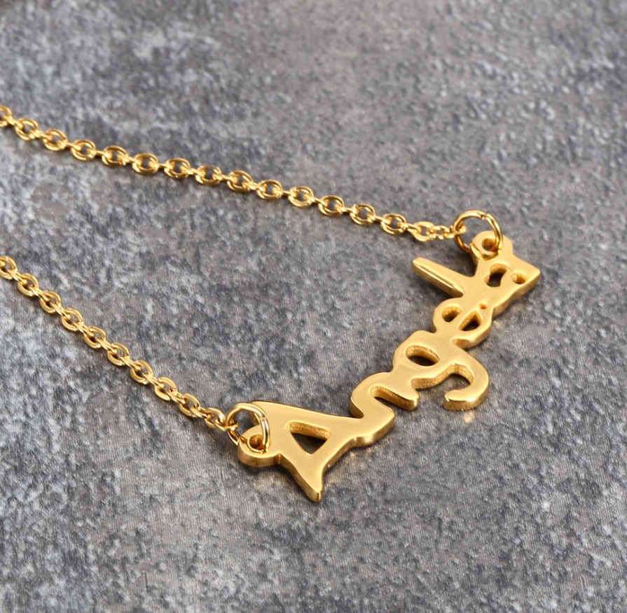 Example of a custom 'Aries' zodiac name necklace in gold plating.