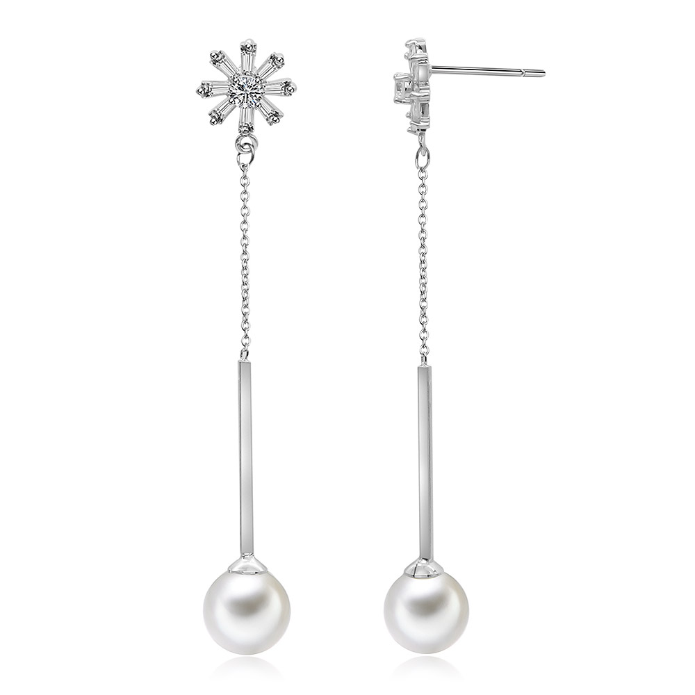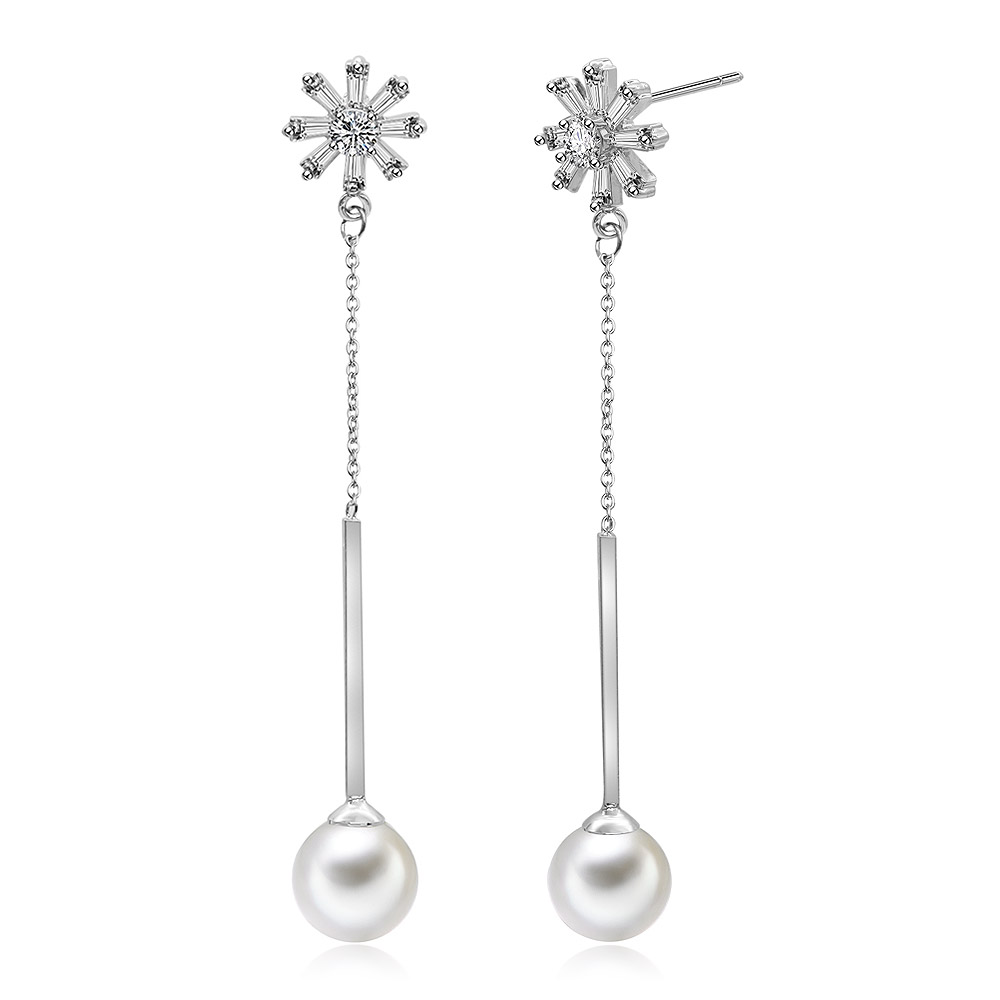 Elegant Brass Drop Earrings with Rhodium Plating and Pearl-like CZ