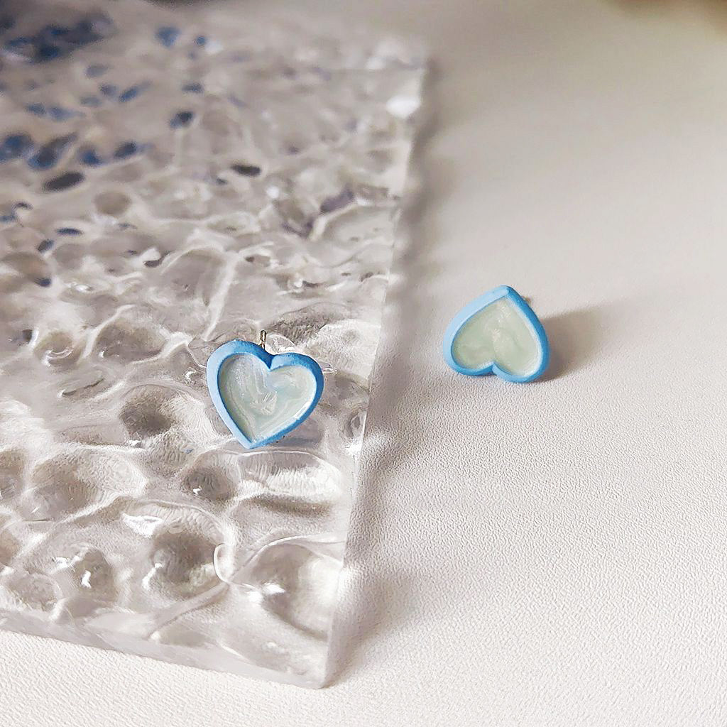 An artistic display of white and blue enamel heart-shaped stud earrings.