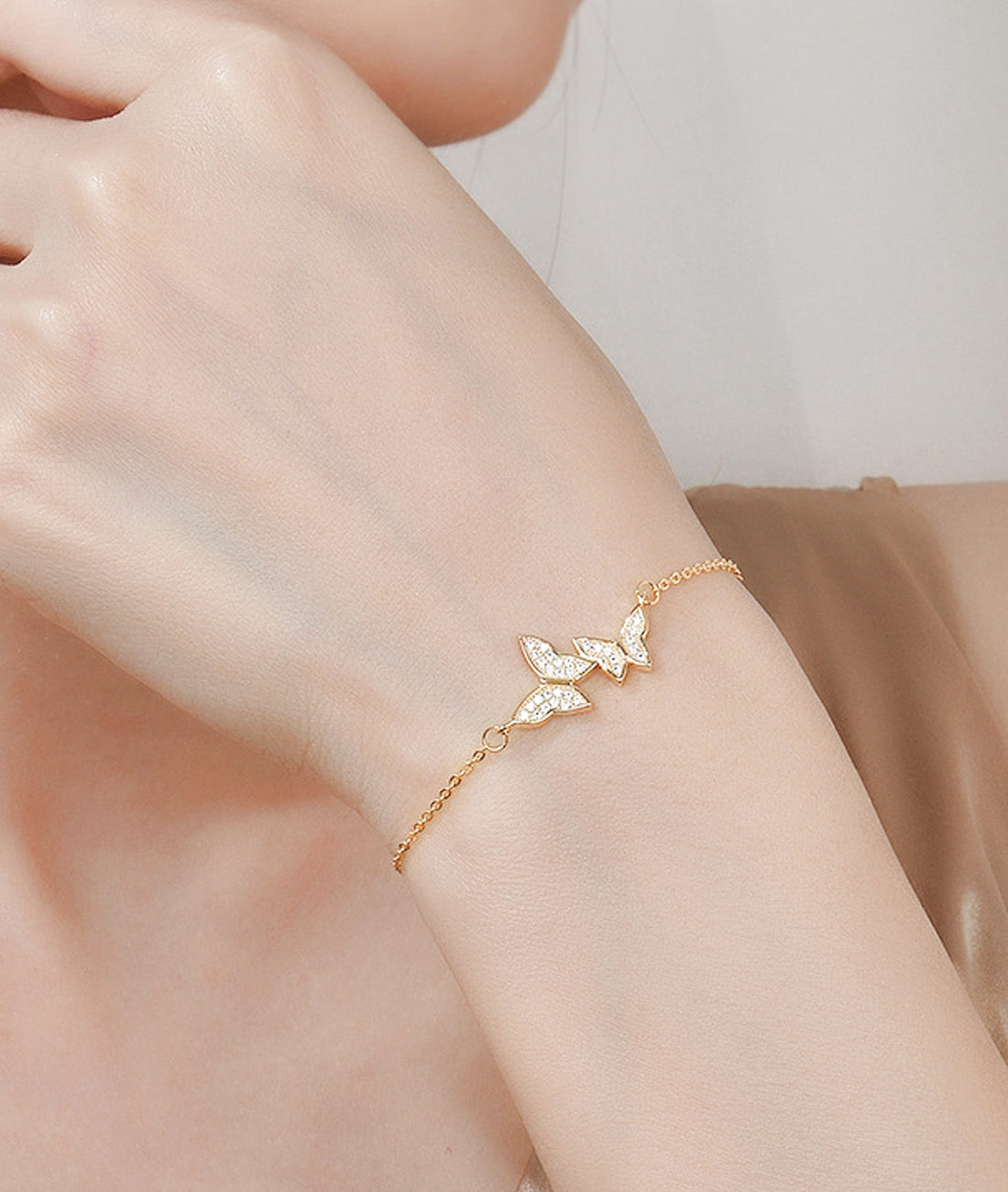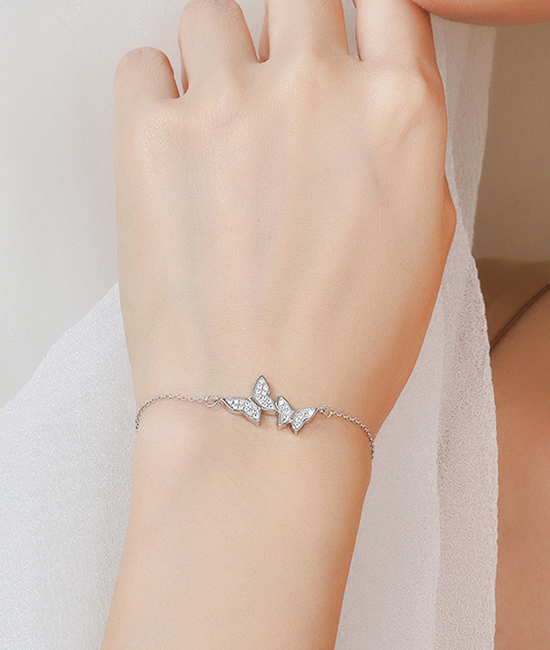 This bracelet masterfully captures the fleeting moment of a butterfly in flight. The butterfly charm, encrusted with dazzling zircon stones, shimmers brilliantly in the light, as if a crystal-clear dance graces your wrist. The fine chain seamlessly blends with the butterfly charm, creating a refined and ethereal sense of elegance. Its adjustable length ensures a flawless fit for various wrist sizes, making it ideal for both solo wear or layered looks, showcasing your unique fashion taste.
