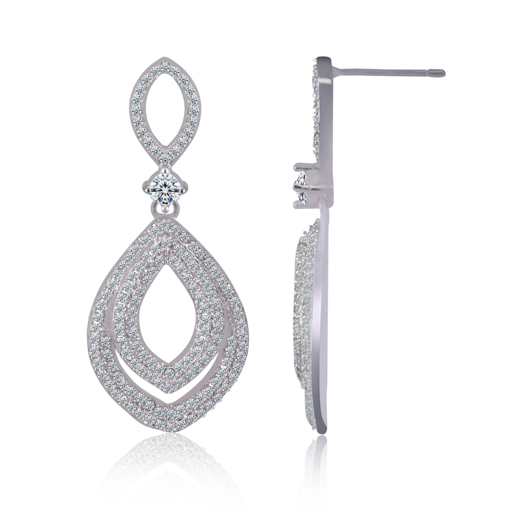 Side and front view of the silver teardrop earrings, showcasing the post-back closure and intricate cubic zirconia setting.