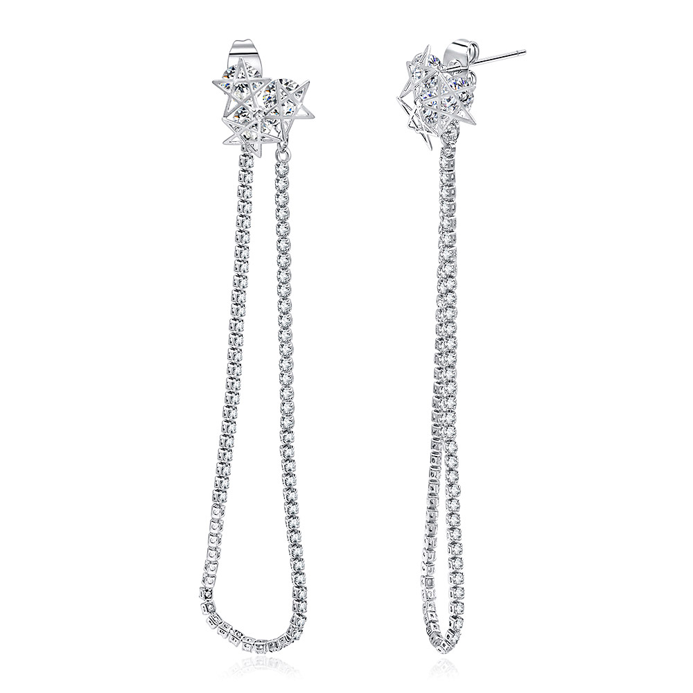 Make a celestial statement with these glamorous Dangle & Drop Triple Star Earrings. Crafted from high-quality brass with brilliant rhodium plating, these earrings feature a cascade of three stars adorned with sparkling white cubic zirconia stones. Their dainty and delicate design is perfect for adding a touch of sparkle to any outfit, ensuring you'll get noticed. Ideal for any occasion, these beautiful sparklers combine trendy style with affordability, making it easy to keep your look fresh and fashionable.