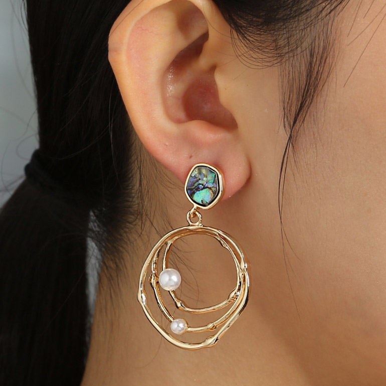 Close-up view of the gold hoop earring with a circular design, highlighting the pearl and iridescent stone details.