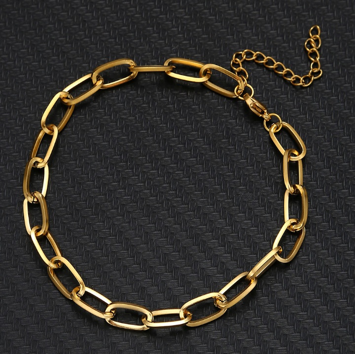 - Detailed view of the gold bracelet's chain links and lobster clasp.