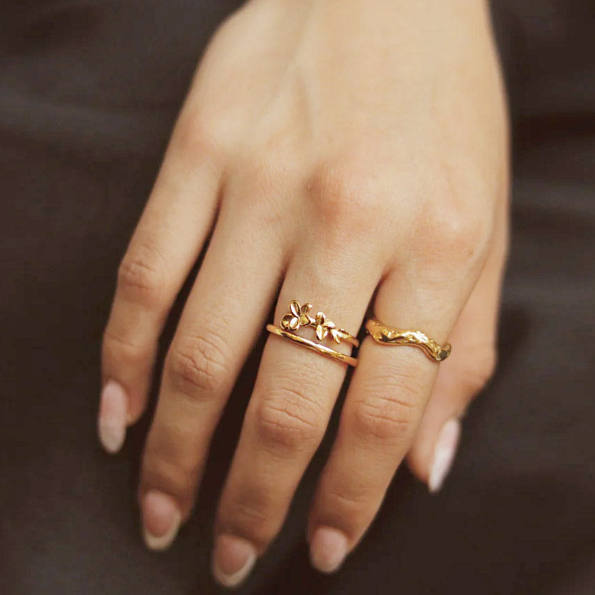 - The floral ring styled with another wavy gold band to showcase stacking possibilities.
