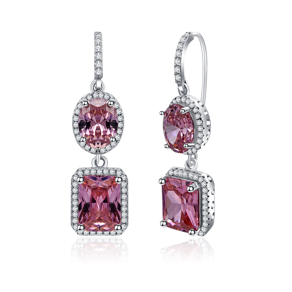 Close-up view of the pink gemstone and white diamond details on the silver-plated drop earrings.