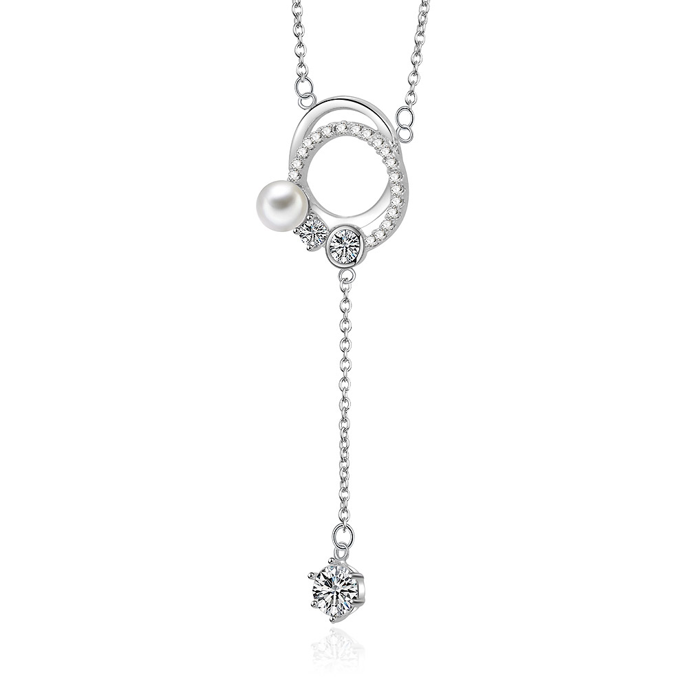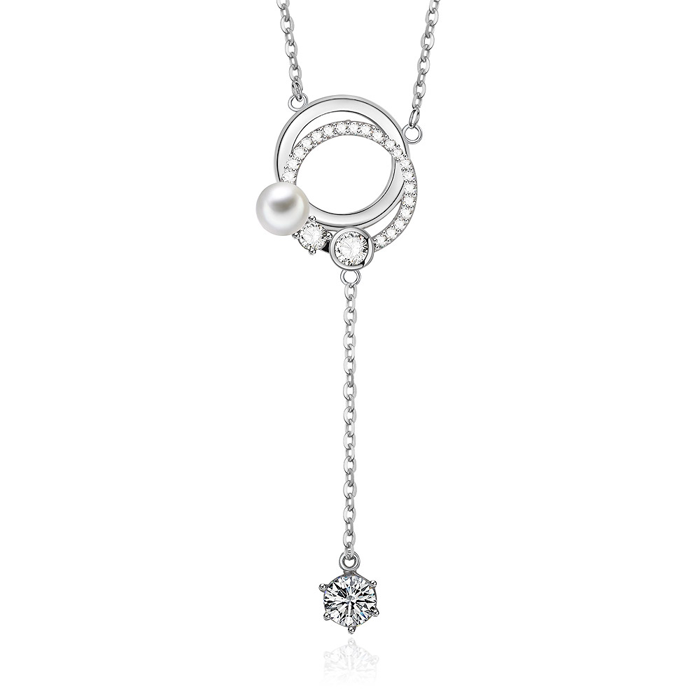 - A detailed view of the double-circle pendant with its intricate cubic zirconia setting and elegant pearl drop.