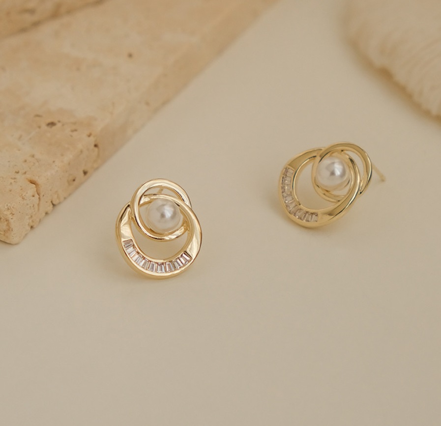 Side angle of the Double Ring Pearl Stud Earrings, highlighting the swirl design and the luster of the pearl.