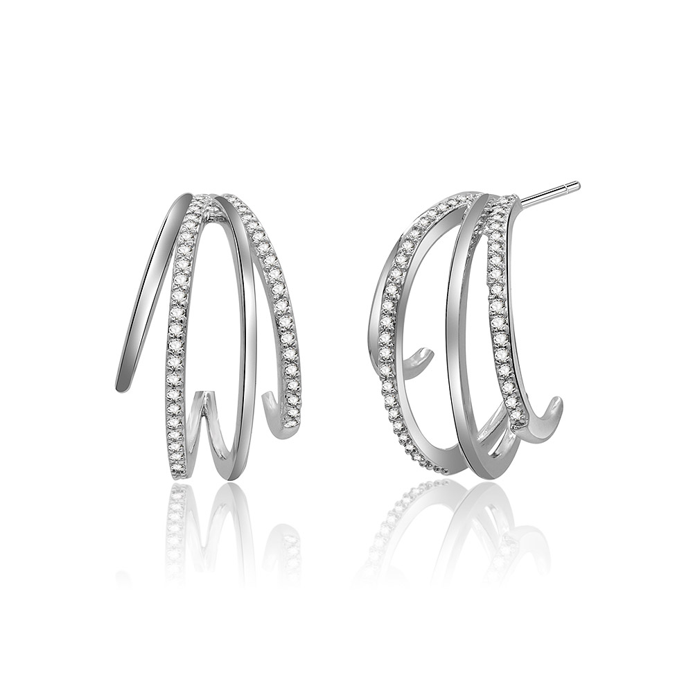 Side view of the double row semi-hoop earrings, showcasing their distinctive curved shape and cubic zirconia details.