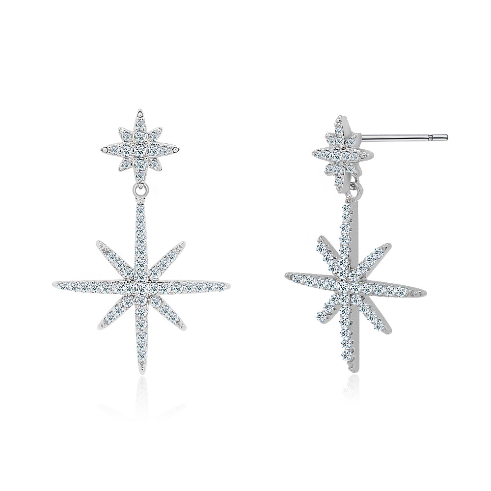 Discover the celestial charm of our Double Starburst Drop Earrings. Expertly crafted from a durable brass base with lustrous rhodium plating, these earrings feature dazzling cubic zirconia stones that capture the light with every movement. Designed for both elegance and comfort, they are hypoallergenic, lead-free, and nickel-free, making them suitable for sensitive skin. With a secure post closure and measuring 25.3x17.0 mm, these stunning earrings are perfect for any occasion, from daily wear to special events. Ideal for fashion brands and retailers seeking high-quality wholesale jewelry.