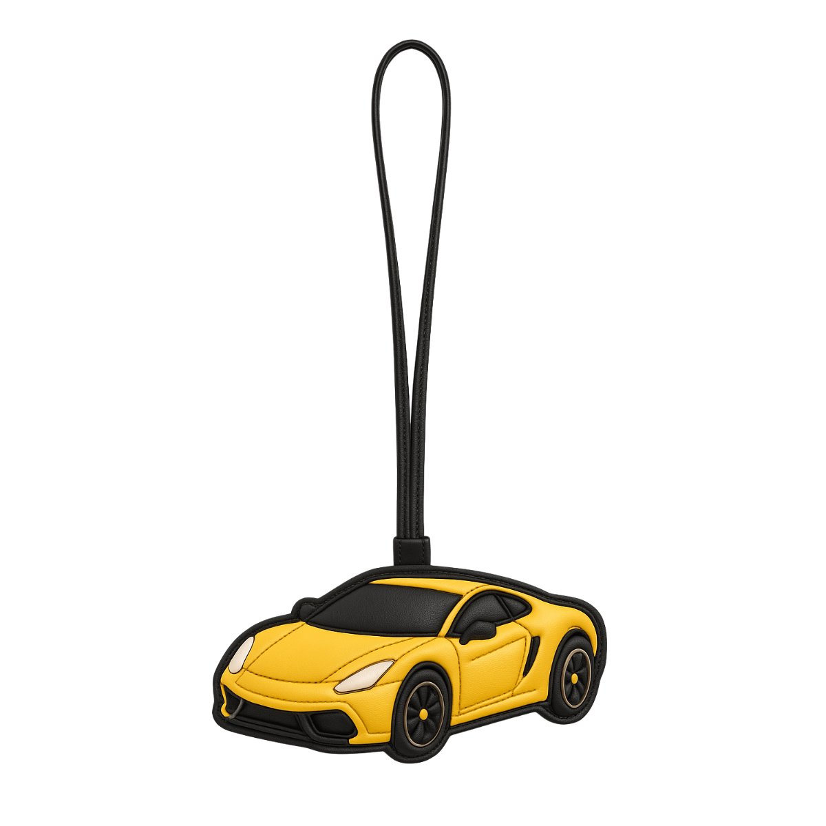 A stylish yellow sports car leather keychain with black detailing.