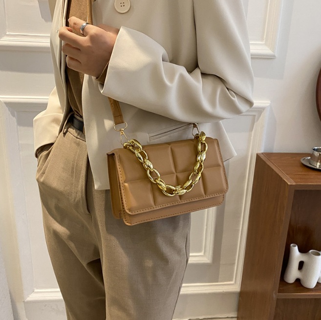 Close-up of the tan version of the Elegant Designer Crystal Chain Handbag with its gold chain.