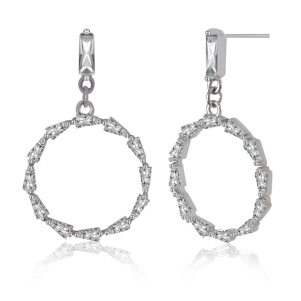 Elevate your style with our Elegant Round Earrings, a stunning addition to any jewelry collection. These drop and dangle earrings are designed with a modern geometric pattern, crafted from high-quality brass and finished with a lustrous rhodium plating to ensure lasting brilliance and prevent tarnishing. The design is brought to life by an array of sparkling white cubic zirconia stones, offering the look of fine diamonds with exceptional clarity and fire.