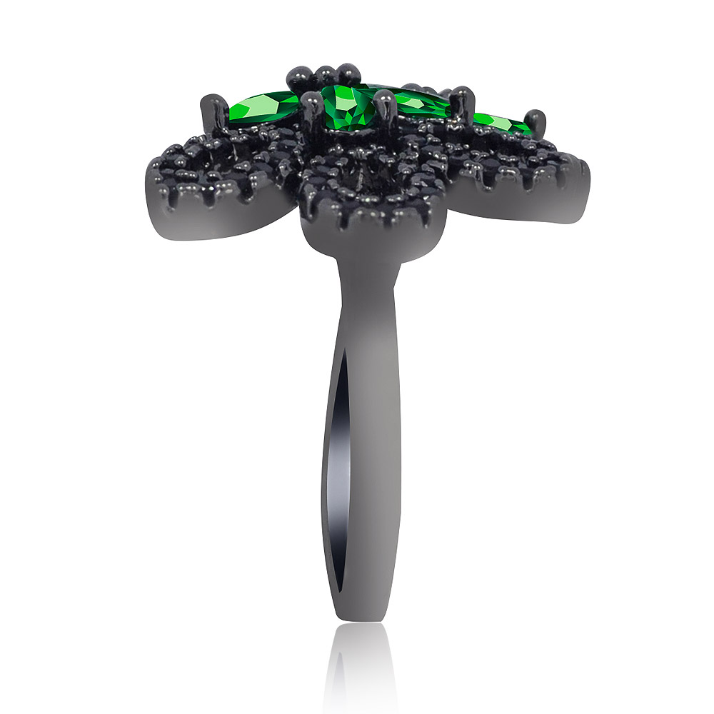 Experience the perfect blend of sophistication and sparkle with the Emerald Hematite Filigree Cocktail Ring. This stunning piece is meticulously crafted to elevate any outfit, making it an essential addition to your jewelry collection. The ring features a detailed filigree design encrusted with glittering cubic zirconia that catches the light beautifully, while a central green glass stone provides a captivating pop of color.
