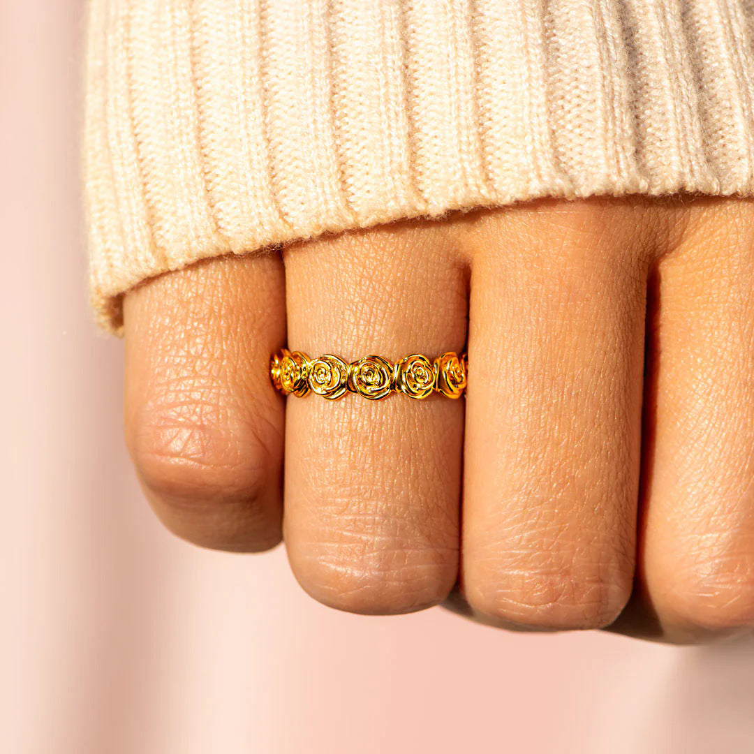 Close-up view of the Eternal Bloom ring's luxurious gold plating and continuous rose band design.