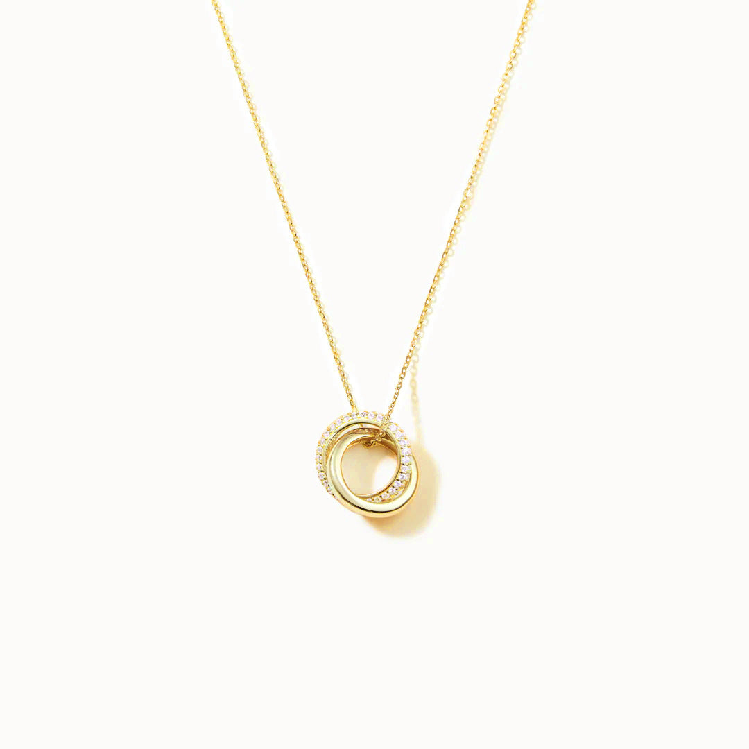 - The Eternal Circles necklace in a regal gold finish, featuring the interlocking circle pendant with sparkling zircons.