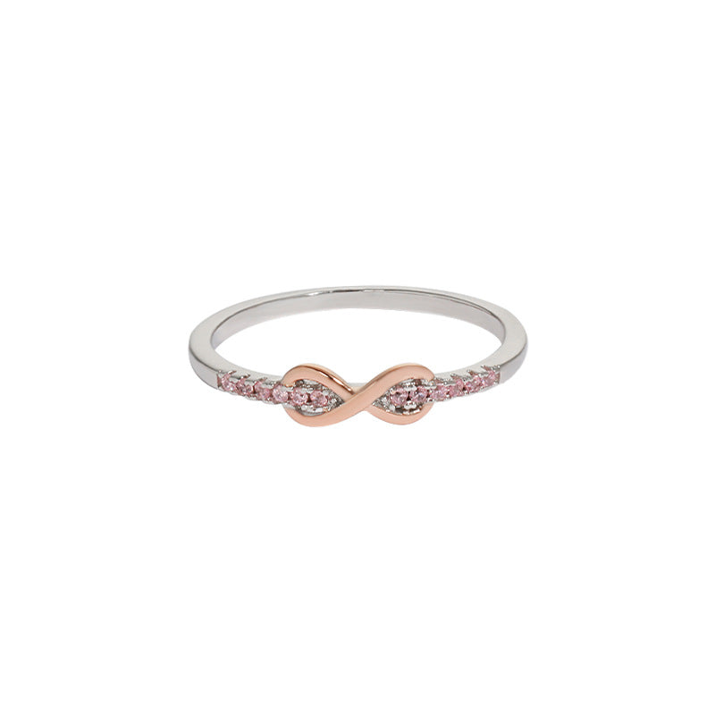 Presenting the "Eternal Love" ring, a stunning piece that beautifully captures the essence of an unbreakable bond. This ring seamlessly blends modern design with timeless meaning. The rose gold infinity symbol serves as a powerful representation of endless love, connecting two hearts for eternity. The delicate zircon stones sparkle like stars along the journey of love, while the polished silver band adds a touch of sophistication, symbolizing every precious moment in a relationship.