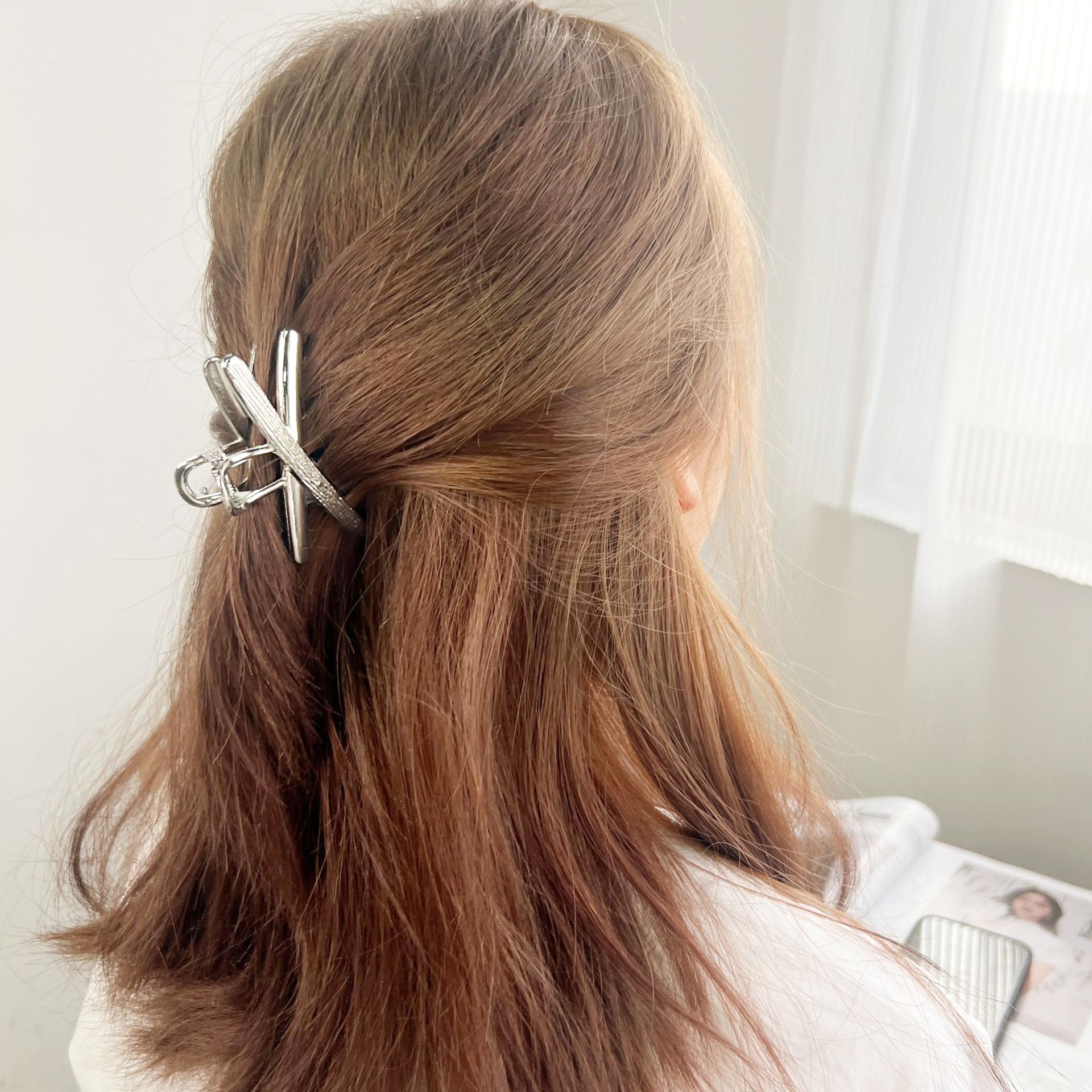 A product shot of the silver hair clip, showing its unique crossed design and textured surface.