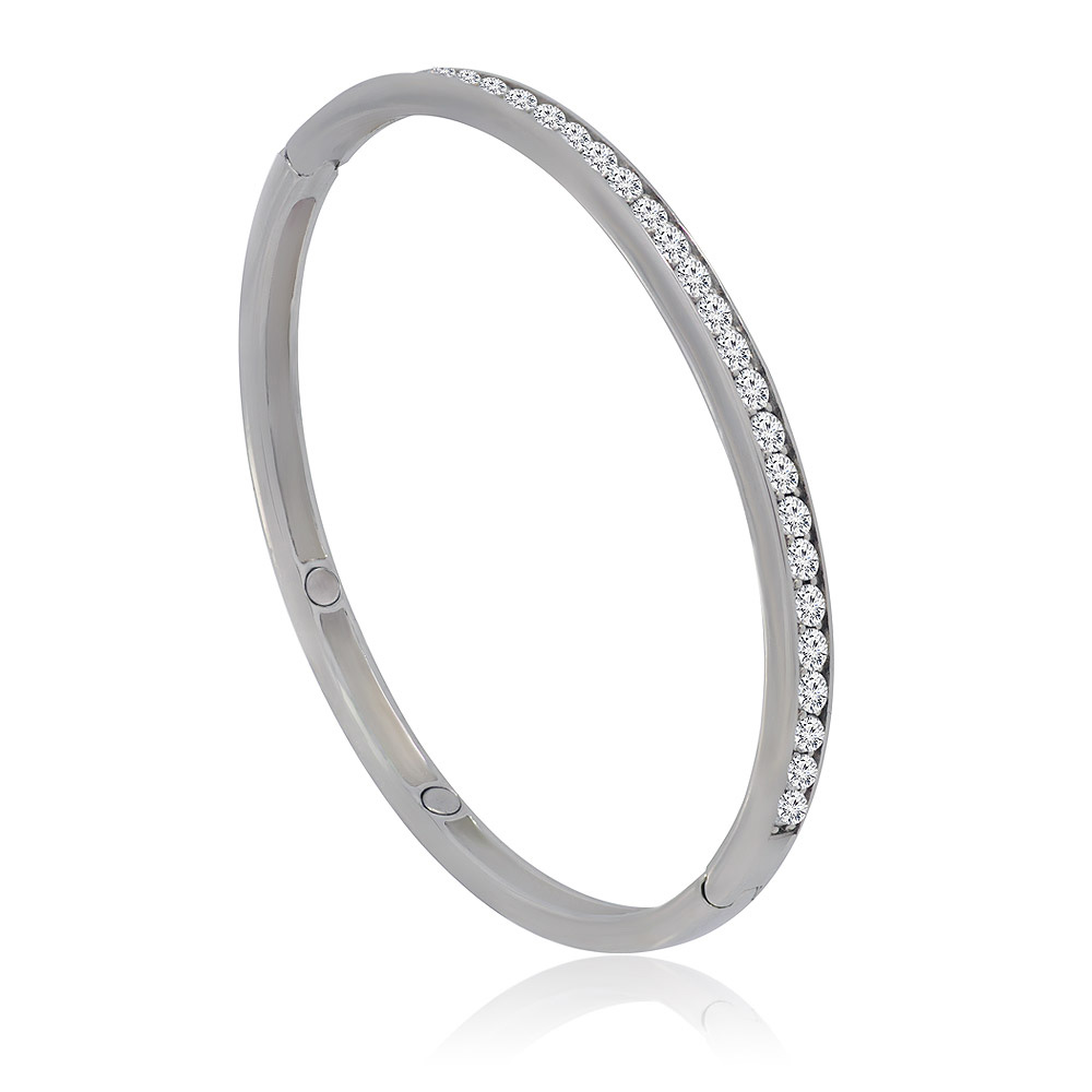 Discover timeless elegance with the 'Eye On Me Bangle' from JR Fashion Accessories. This glamorous piece is crafted from high-quality brass with a lustrous rhodium plating to resist tarnish and provide a brilliant shine. The bangle is meticulously set with a continuous row of sparkling princess cut Cubic Zirconia stones, offering the luxurious look of diamonds. Featuring a secure clasp closure and a comfortable 60mm inner diameter, this 4mm wide bangle is a perfect accessory for both everyday wear and special occasions.