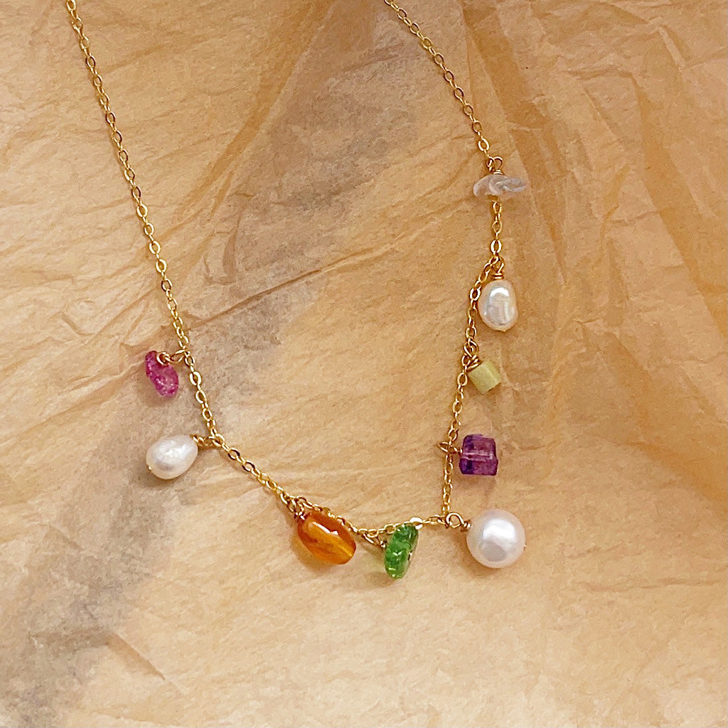 Detailed view of the colorful gemstone and pearl necklace, highlighting the unique bead combination.
