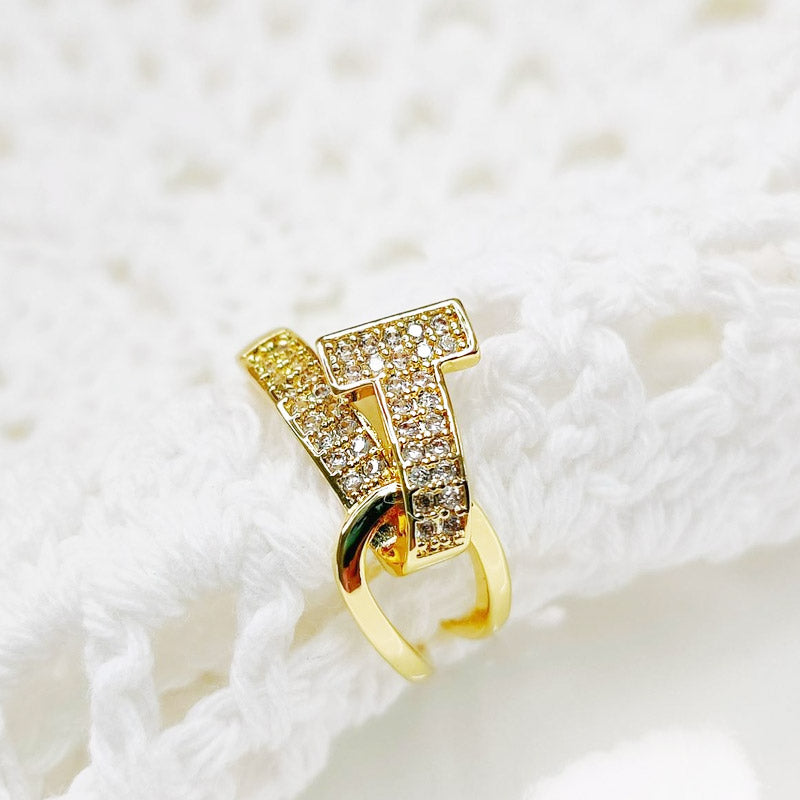 Stylish gold-plated ring featuring a modern 'H' design studded with brilliant zircons.