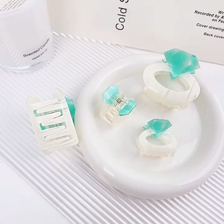 These fashionable hair clips are crafted from high-quality acrylic, ensuring both durability and a lightweight feel. The design features a distinctive diamond-ring shape with a beautiful turquoise-colored accent, perfect for adding a pop of color and modern flair to any look. Each set contains five clips, providing excellent value and versatility for various styling needs.