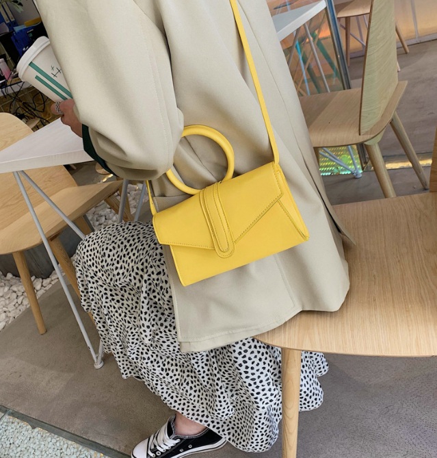- Close-up of the yellow version of the PU leather shoulder bag, highlighting its texture and color.