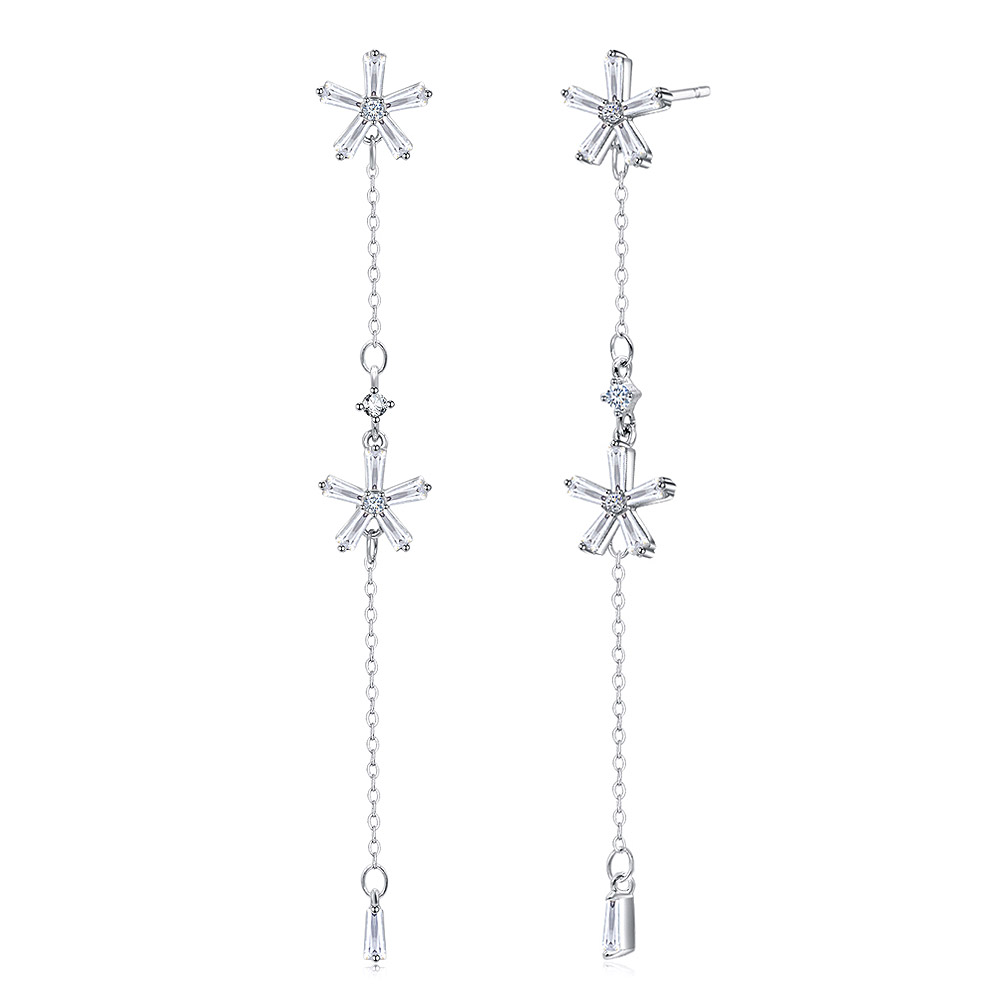 Detailed view of the Flower Baguette-Cut Diamond Dangle Earrings, highlighting the silver flower-shaped top and chain element.