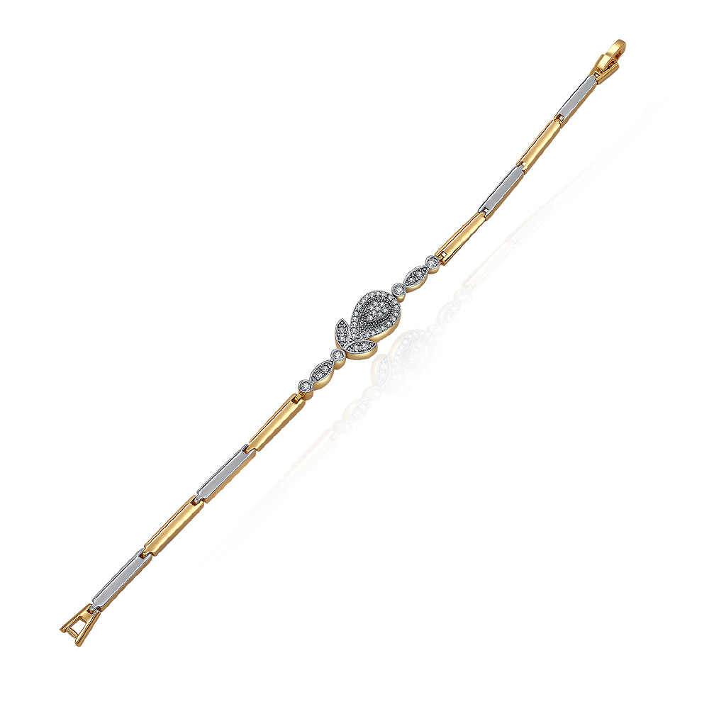 The bracelet features a durable brass core with elegant gold and rhodium plating, creating a beautiful contrast. The design is centered around a floral-inspired bar pendant, meticulously set with brilliant white cubic zirconia stones that shimmer with every movement.