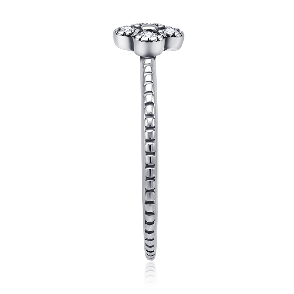 Side view of the sterling silver flower ring, highlighting the four clear cubic zirconia gemstones.